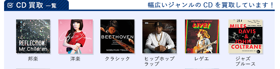 CD買取の一覧をご紹介します。幅広いジャンルのCDを買取しています!買取対象は邦楽、洋楽、クラシック、ヒップホップ・ラップ、レゲエ、ジャズ・ブルース