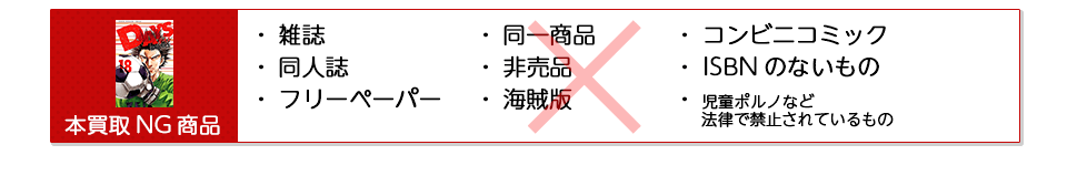 本・漫画の買取NG商品をご紹介します。・雑誌 ・同人誌 ・フリーペーパー ・同一商品 ・非売品 ・海賊版 ・コンビニコミック ・ISBNのないもの ・非売品 ・児童ポルノなど法律で禁止されているもの