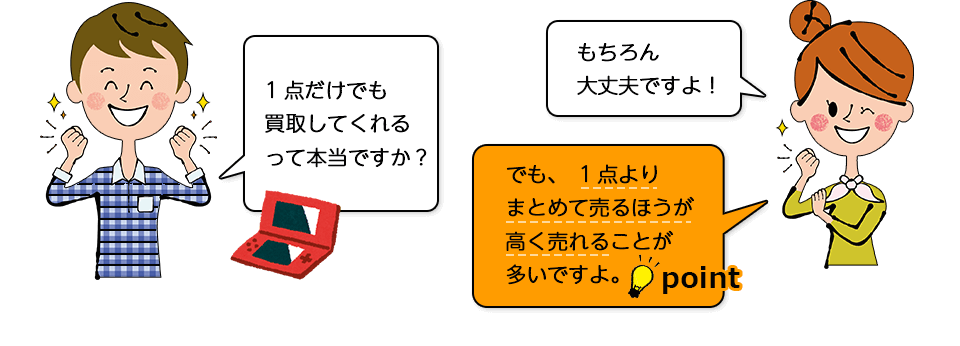 1点だけでも買取できます。でも、1点よりまとめて売るほうが高く売れることが多いですよ。